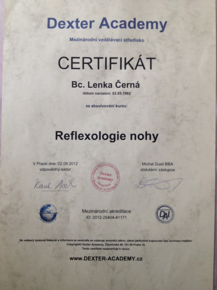 Jsem certifikovaný reflexní terapeut. Certifikát zde: Reflexologie nohy